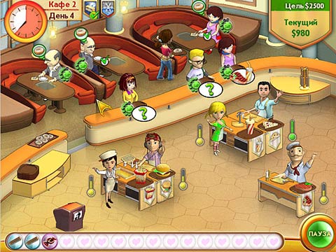 С первого дня вы сразу окунетесь в работу. Цель такова: появляется посетитель, вы сразу же кликаете на нем, чтобы узнать за какой едой он пришел. Кстати, перед открытием лучше активировать всех доступных работников щелчком мышки. Чтобы к тому времени как вам поступит первый заказ, ваша еда была готова наполовину. Помните, что за одну смену может быть приготовлено не более 2 блюд за одним столом. После этого вам нужно взять щетку и почистить стол, иначе работник откажется дальше готовить, а клиенты покинут вас так и не дождавшись вкусной еды.