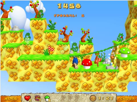 Ваша основная задача собрать все грибы и сундуки с сокровищами, чтобы получить ключ, который откроет вам дверь для перехода на следующий уровень. Но двери бывают разных цветов, чтобы их открыть, надо использовать ключ соответствующего цвета. Конечно, на каждом уровне вы сможете набрать определенное количество дополнительных жизней и бонусов. Обычно бонусы находятся в ящиках, которые можно разбивать или проталкивать вниз, ударяя по ним кувалдой. Ящик разбивается сам, когда падает с большой высоты.