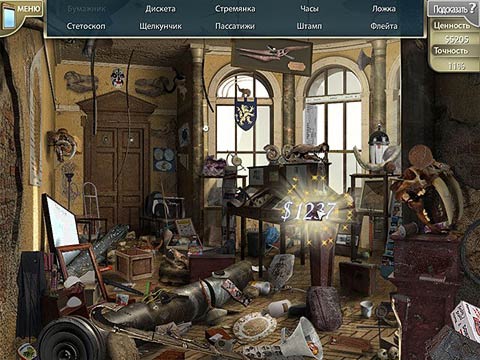 К слову, о бонусах. Хоть это и не самая главная составляющая, но и она имеет свою ценность, ведь «Побег из музея» - игра сложная (вам еще предстоит убедиться в этом). Есть стандартные подсказки, отображающие на экране мобильного телефона местоположение вещи. За каждую находку дают деньги, а клик мимо сказывается на параметре «Точность». Замечательная идея, делающая «я ищу» в три раза логичнее, а не превращая ее в чемпионат по скорости нажатия на мышь.