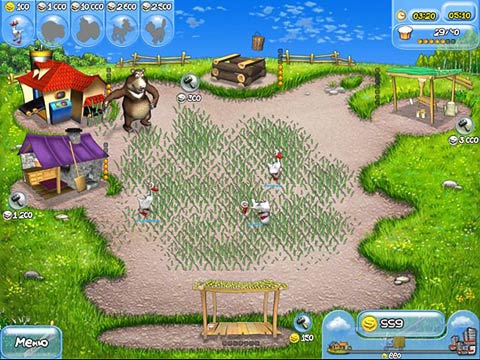 А кроме гусей к вам добавятся овечки и коровы, кошка ( которая будет помогать собирать яйца) или собака, которая будет отгонять медведей. Кстати, о медведях. Очень колоритный персонаж, который будет приземляться на ваш участок как снег на голову ( в прямом смысле этого слова). Они буду ловить и есть ваших животных. Поэтому как только увидите на земле тень – приготовьтесь кликать на медведе ( чем чаще будете кликать, тем быстрее засадите его за решетку) и бегом везите его на базар. Там вы сможете выгодно его продать и купить себе животных. А также, вы можете делать из яиц майонез и потом сможете делать выпечку и этим тоже зарабатывать деньги. Итого, мы имеем