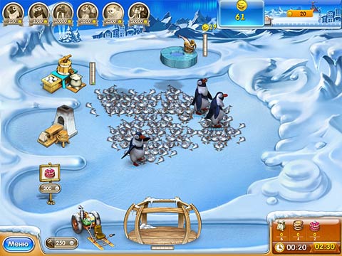 Как и в предыдущих частях, уровни будут усложняться с нарастанием. На первом уровне вам объяснят основные действия и познакомят с питомцами. На сей раз мы с вами будем выращивать пингвинов. Они, как известно, питаются рыбой. А значит, ее мы будем добывать из колодца. Пингвины очень прожорливые существа, поэтому не забывайте следить за уровнем рыбы в колодце. Главное - чтобы у вас всегда было 19 монет на внеплановое пополнение запаса рыбы. Пингвины нам будут давать яйца, которые мы собираем и успешно помещаем на склад. От туда мы их будем распределять по надобности: то ли на базар, то ли на заводик. Вначале мы освоим приготовление простых продуктов: собираем яйца, помещаем их в заводик для производства яичного порошка, затем мы можем выпекать блины, а полетев на вертолете на базар (не забываем, что некоторые продукты вы можете только купить), вы приобретете муку. И смешав эти ингредиенты, сможете испечь очень вкусный пирог. И далее по нарастающей. Вы будете осваивать производство мороженого, а также поможете Деду Морозу подготовить подарки и новогодние костюмы для детей.