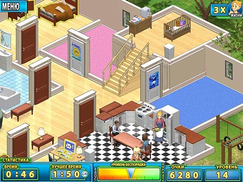 Итак, играем за няню. Большой дом, неряшливая семья – за всем этим нужен уход. Каждый уровень (день) необходимо выполнять определенную работу по дому: погладить, постирать, прибраться, приготовить обед. Для этого достаточно кликнуть мышкой на очаге хаоса и беспорядка – и няня все сделает.