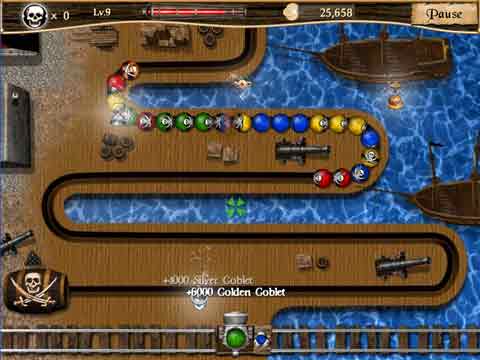 Что делать? Управляем процессом с помощью «мышки». Внизу поля по горизонтали ездит ваша гаубица, сверху же засыпаются шары и катятся по причудливо изогнутому желобку. Двигая гаубицей влево-вправо, прицеливаетесь по группке шариков и – огонь!!! Если шарики такого же цвета, что и ядро, которым вы стреляете – они непременно взорвутся и исчезнут, если нет – ну что же, добавите еще один шарик в цепочку…Короче – типичная «Зума», если знаете о чем я, только с пиратским уклоном.
