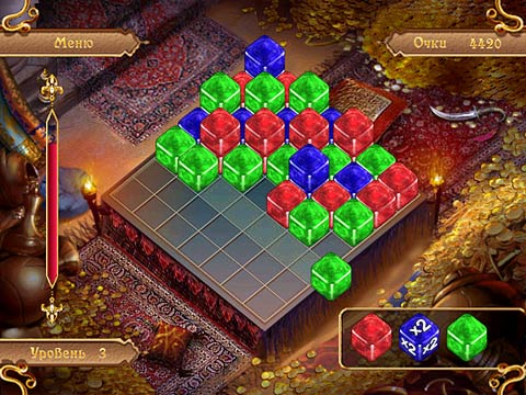 Достоинства игры и ее отличия от подобных игр С первых же секунд мы попадаем во дворец. Сразу вспоминается сказка про Аладдина и царевну Будур. Очень хорошая графика игры и интересный геймплей захватят все наше внимание. Основной принцип игры – собрать по 3 драгоценных камня одного цвета, однако нам не надо переставлять их местами, а просто выбрать нужную линию и «запустить» по ней камень. При соединении 3 и более кубов одного цвета – они исчезают. Принцип похож на Алмазная Одиссея. В игре 3 режима, которые позволят как начинающим, так и настоящим мастерам по решению головоломок, найти свой любимый стиль игры. Режим «Пазл»: разбираем фигуры на поле. Режим «На время»: нужно очистить игровое поле за определенное количество времени. Режим «Аркада»: нужно набрать определенное количество очков, чтобы пройти уровень. Набирать очки нужно быстро, потому что на поле постоянно добавляются новые камни