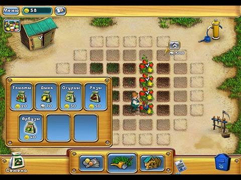 В нашем фермерском арсенале есть: лопата (1 шт.), газонокосилка (1 шт.), колонка с водой (тоже 1 шт.), поле (точный размер земельного участка определить не удалось) и склад, где будем хранить урожай. Далее все просто – нужно поливать и окучивать землю, а когда придет время – собирать плоды своего труда.